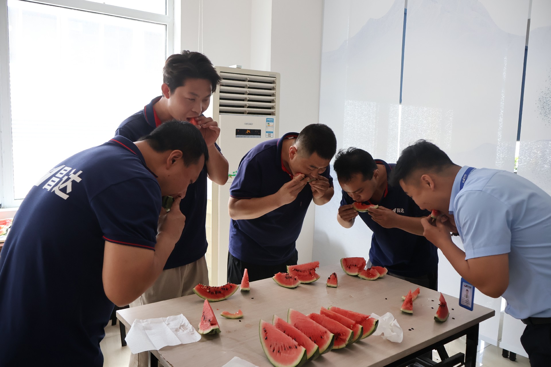 紅艷艷、水靈靈的西瓜瓣一字排開,夏日終極誘惑在此!壽星勇士們摩拳擦掌,哨聲就是沖鋒號!低頭、開啃!汁水飛濺?顧不上!瓜籽亂跳?管不了!此刻眼里只有甜蜜目標(biāo)。鼓起的腮幫子、專注的眼神、此起彼伏的“吸溜”聲,拼的就是速度與豪爽!誰是真正的“吃瓜群眾”代表?看誰面前的瓜皮山最高!