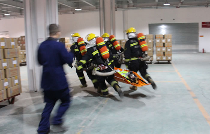 本次演練假設:3月24日下午,昌達集團一倉庫由于電線短路起火,引燃倉庫圖書發(fā)生火災,庫房各崗位員工立即停止工作,捂住口鼻,彎腰前進,逃離“火場”,1人被困,昌達消防隊立刻集結,全副武裝到場處置,連接兩支水槍進行有效地撲救工作。與此同時,目擊者第一時間撥打119報警,固安縣新昌西街消防救援站接警后,立即派出5部消防車、20名指戰(zhàn)員,同時調度周邊的小型消防站到場施救。十分鐘后,消防救援力量趕到公司,迅速展開滅火戰(zhàn)斗,“火情”很快得到有效控制,“被困人員”被成功解救。
