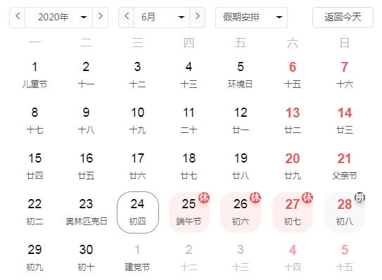 放假時間為2020年6月25日至27日,共3天
