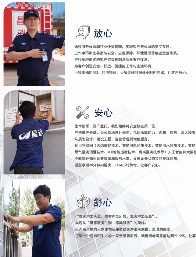 通過(guò)服務(wù)體系和物業(yè)便捷管理,實(shí)現(xiàn)客戶與公司的高度互通,工作中不斷完善消防安全、應(yīng)急保障、環(huán)境管理等物業(yè)運(yùn)營(yíng)體系,推行多種形式的客戶監(jiān)督機(jī)制及品質(zhì)管控體系,為客戶創(chuàng)造安全、舒適、便捷的工作與生活環(huán)境,小項(xiàng)維修時(shí)間2小時(shí)內(nèi)完成,大項(xiàng)維修時(shí)間48小時(shí)內(nèi)完成,讓客戶放心。